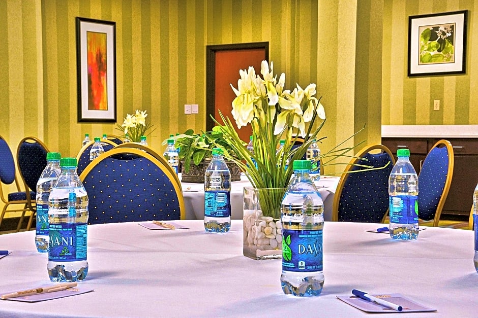 This suite has a seating area, microwave, and refrigerator. The private bathroom has a roll-in shower.